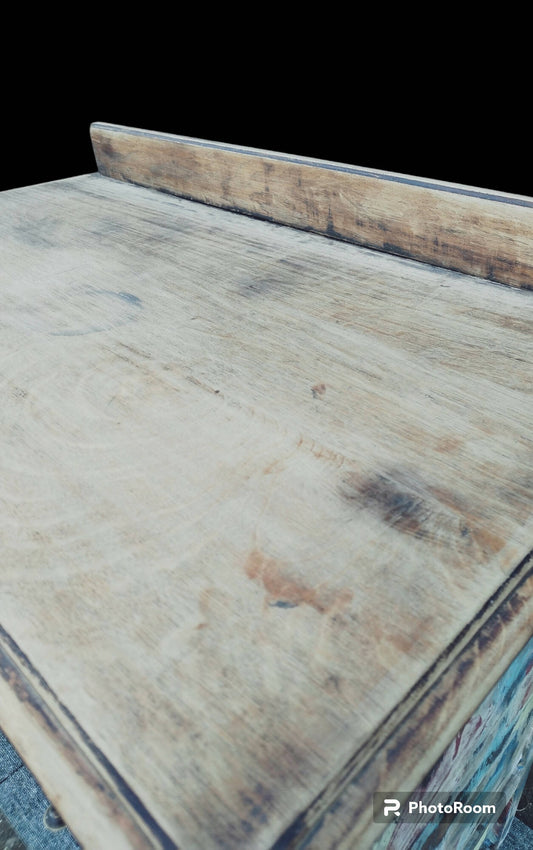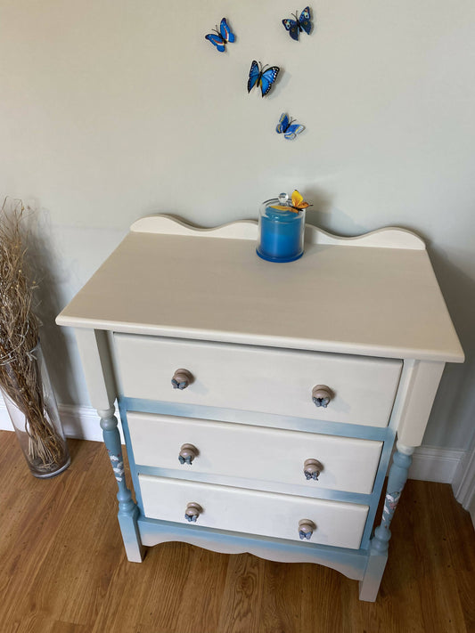 Painted solid pine cream and blue chest of drawers with 3 drawers under /children’s bedroom furniture