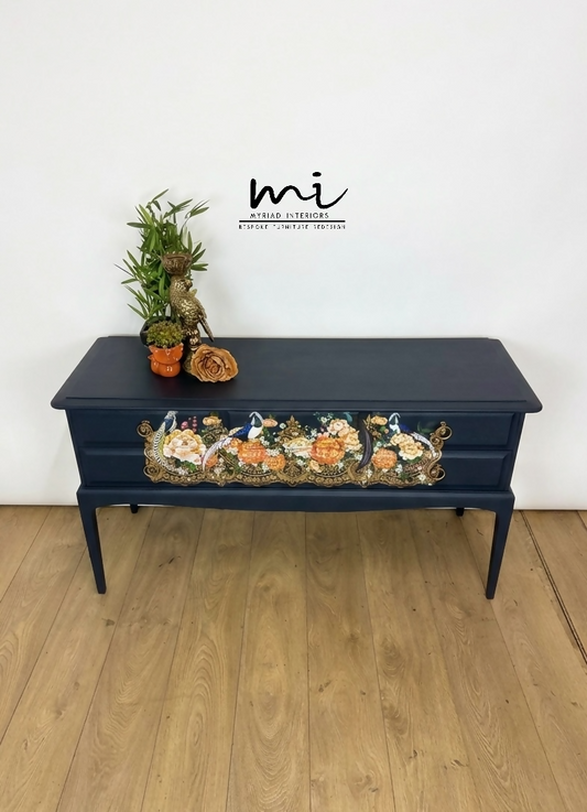 Refinished Navy Blue Stag Minstrel Sideboard with Floral and bird design maximalist, console table, tv stand, media unit, chest of drawers