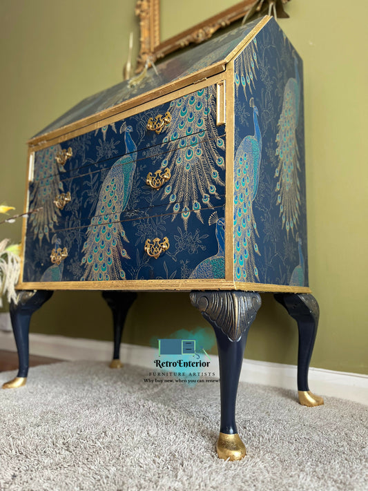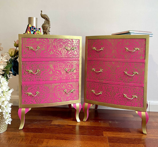 Made To Order Pair of vintage Stag Minstrel 5 drawer chest of drawers, large bedside tables, navy blue floral bird design, dresser, sideboard, teal