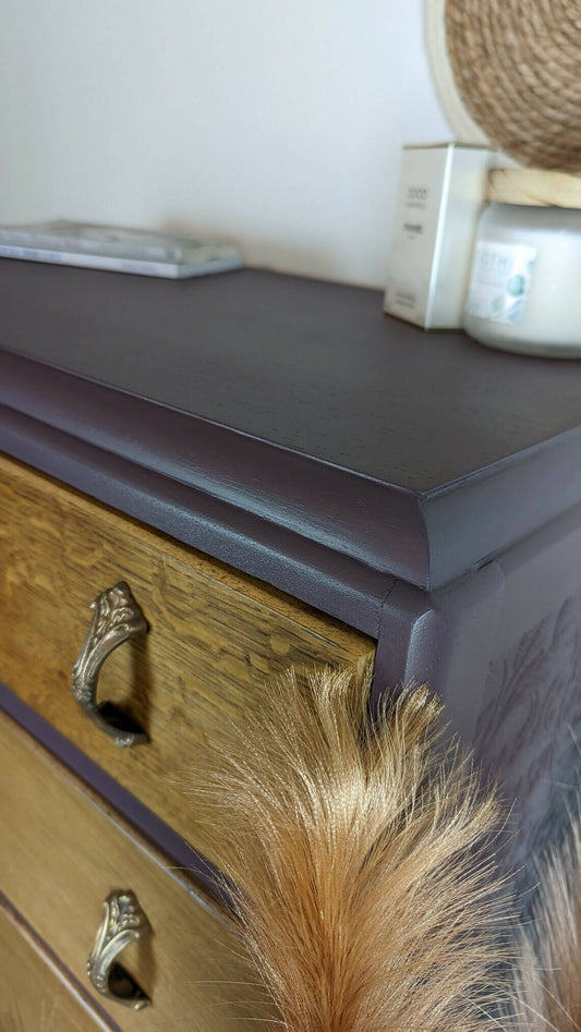 Stag 4/2 chest of drawers. 6 drawer painted navy blue with stripped wood top.
