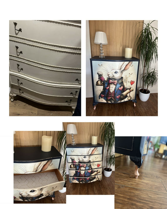 Upcycled 5 draw Alice in wonderland theme chest of draws