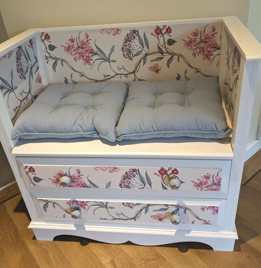 White and floral bench seat with storage