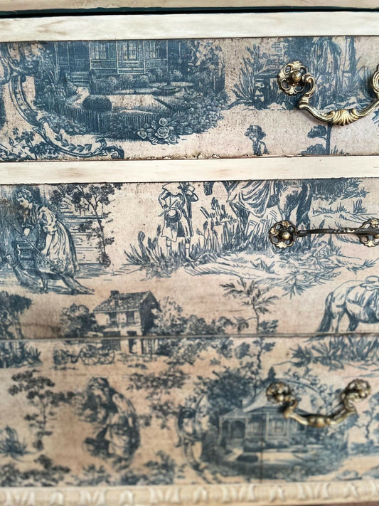 French Toile Vintage Distressed Cream Blue Navy Stubbing Refurbished Bureau