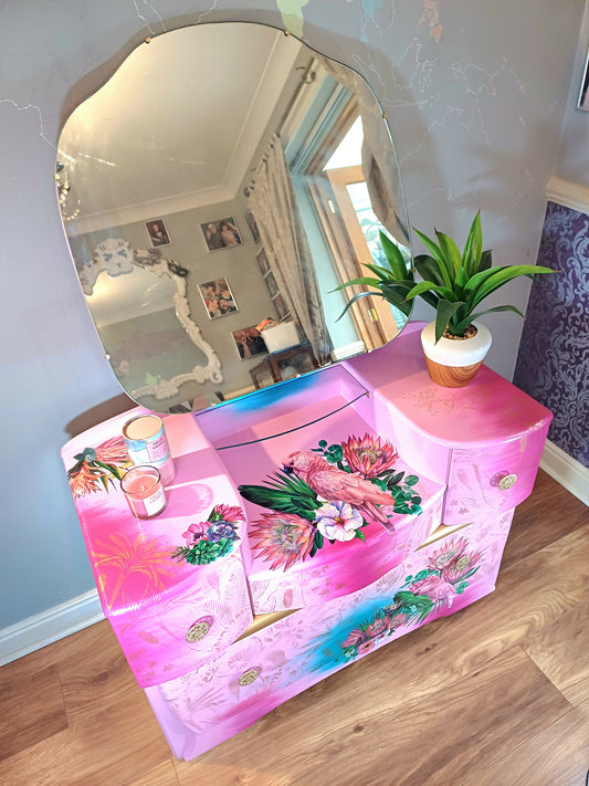 Upcycled Pink and Gold Tropical Dressing Table with Mirror and Five Storage Drawers
