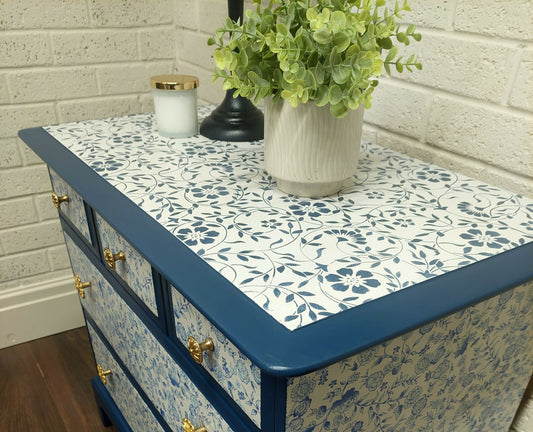MADE TO ORDER Refurbished vintage Stag Minstrel large captains chest of drawers, navy blue, floral bird design, dresser, large sideboard mid century, teal