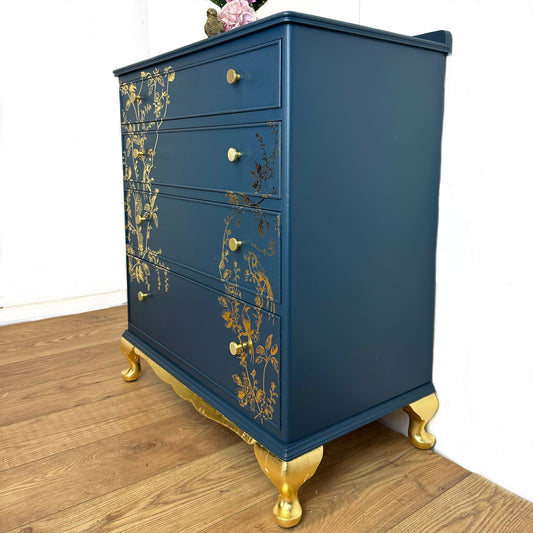 Made To Order - Pretty Refurbished vintage chest of drawers, navy blue with gold foil design, bird song, art deco dresser