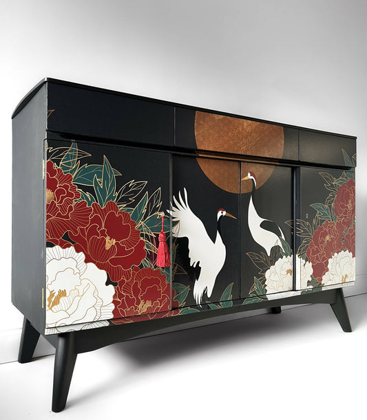 Upcycled Vintage Sideboard TV Console With Oriental Crane and Blossom Design