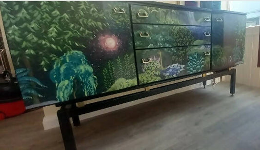 Midcentury Sideboard Black Nature Trees Print. Upcycled Painted Living Room