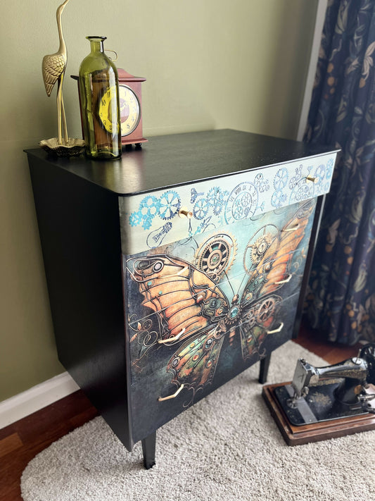Refurbished vintage stag minstrel wardrobe, dresser, drawers, upcycled, black, gold, decoupage