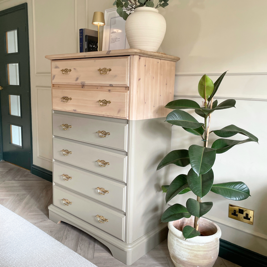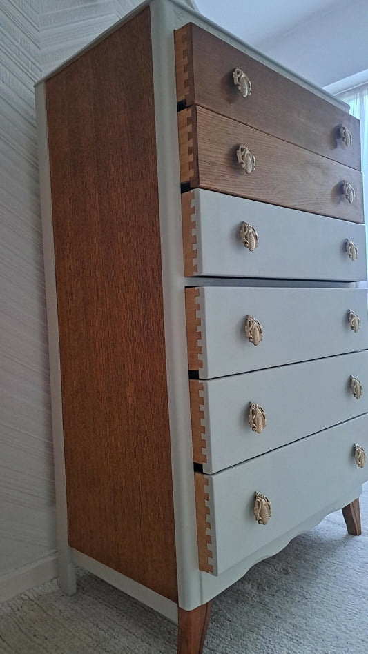 Hand Restored Vintage Tallboy Chest of Drawers in Cafe-Lux & Natural Wood, Brass Hardware, Scandi Modern Bedroom Storage