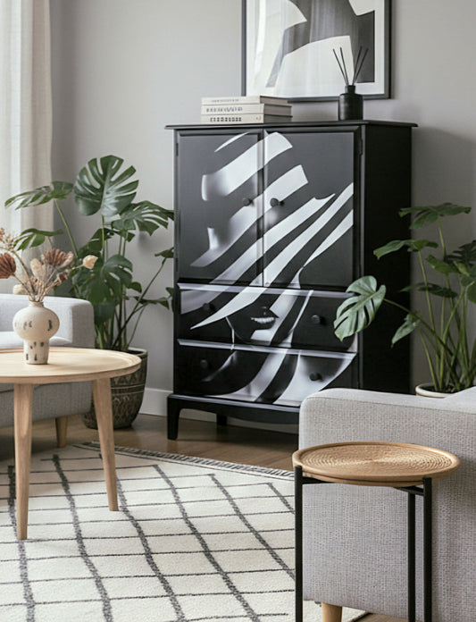 Stag Linen Press | Jet Black Gloss Cabinet with Striking Femme Artwork & Dramatic Yellow Interior
