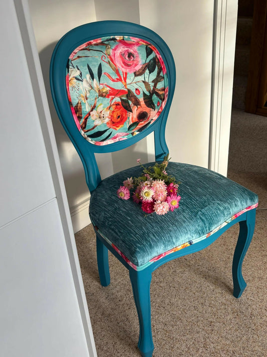 Hand-Upholstered Teal Floral Chair – Vintage Velvet Accent Piece