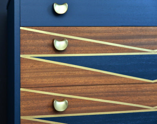 Mid Century Drawers, Teak Chest of Drawer, Blue and Gold.