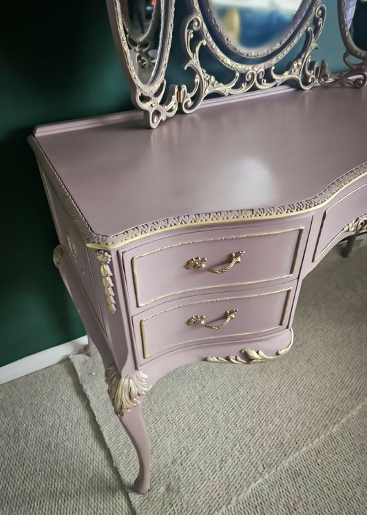 Upcycled , french Rococo style vintage dressing table , painted dusky pink with triple oval mirror and gold accents for bedroom