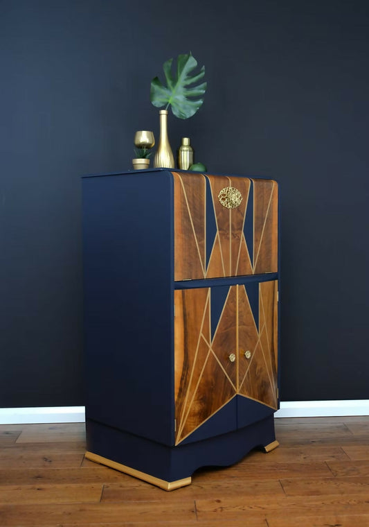 "Stellar", Art Deco Cocktail Cabinet,Burr Walnut, Navy and Gold Art Deco Style,