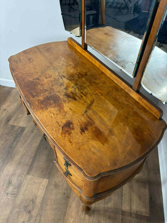 Vintage Walnut Veneered Dressing Table with Triptych Mirror