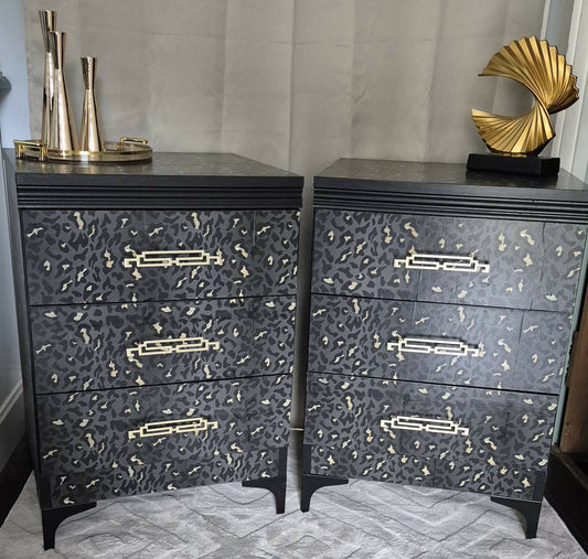 Luxe Black & Gold upcycled Leopard Print Bedside Tables | Art Deco Glam