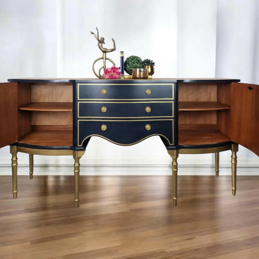 Strongbow sideboard, navy,buffet,tv stand media unit,navy furniture, decoupaged, furniture transfers, peacocks,gold,navy sideboard,statement