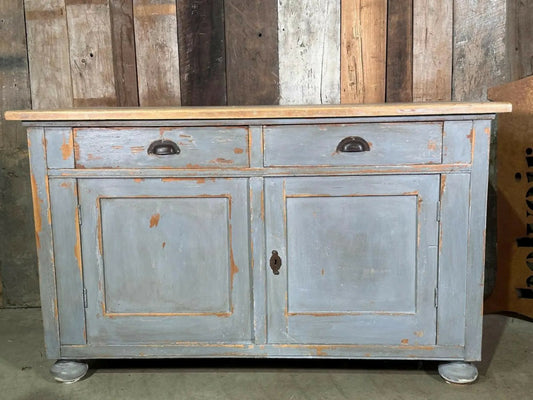 Antique Pine French Housekeeper Base Cupboard Grey Blue Painted, c 1830