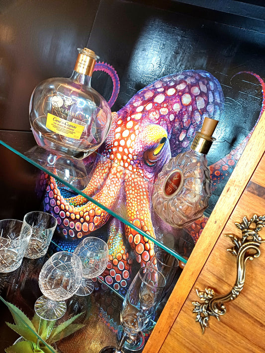Upcycled / Restored Decoupaged Black Cabinet with Octopus Design, Glass Shelves and Storage