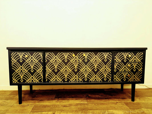 Black & Gold, Geometric Stencilled Upcycled, Painted Dresser – Striking Modern Glamour with Hand-Finished Detail