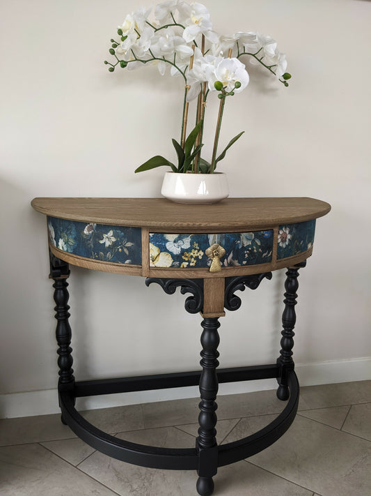 SOLD - Ornate Vintage Half Moon Console With Black Legs And Floral Decor