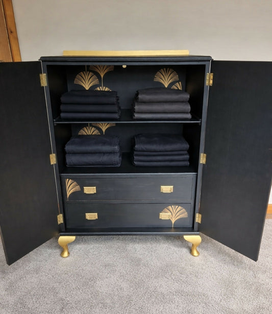 Vintage Solid Wood Wardrobe | Hand Painted Green & Oak Armoire | Dovetail Drawers | Shelved Larder or Linen Cupboard | Working Key