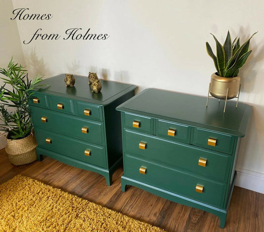 Stag Bedside Tables, spray painted Dark Green Gold bedside drawers, Stag Minstrel nightstands