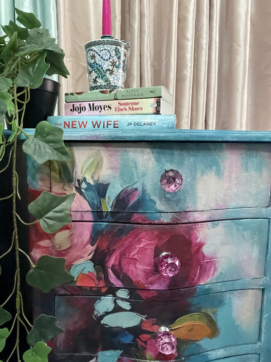 SALE Small Vintage Oak Bedside Cabinet. Pop Art Orchids