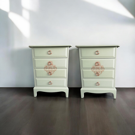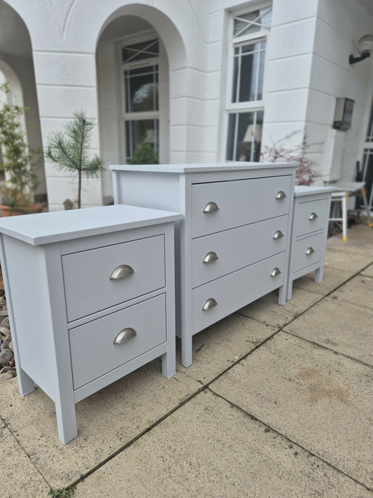 Beautiful bThis stunning large chest of drawers and bedside drawers have been painstakingly transformed using Frenchic paints, waxes and Sheen's. The drawers have been strengthened and lined with gorgeous embossed paper to keep your clothes cosedroom set