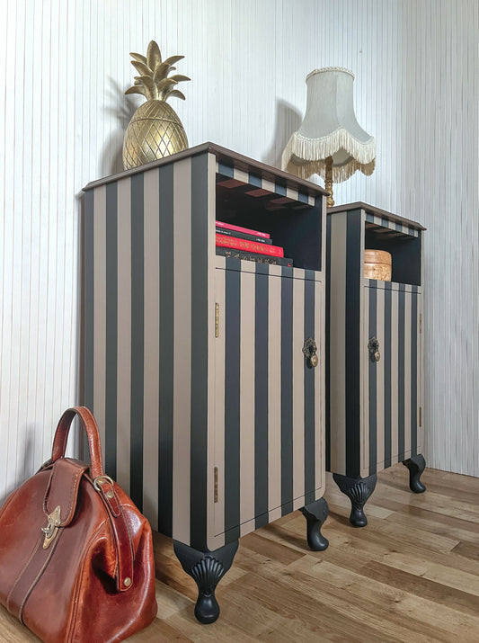 Pair of Vintage Neo-Regency Bedside Tables | Hand Painted Striped Nightstands