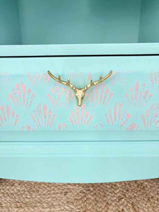 Pair of Stag Minstrel Hand Painted Bedside Tables | Mint Green Nightstands with Golden Stag Handles | Vintage Upcycled Furniture