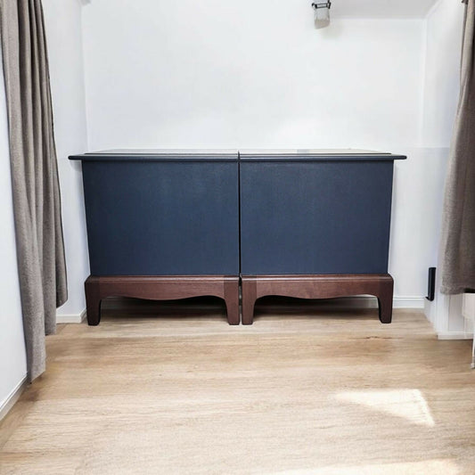 refinished vintage Stag Minstrel bedside tables in navy blue with gold handles. nightstand, chest of drawers, drawers