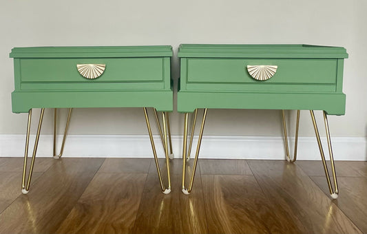 Made To Order - Refurbished vintage Stag Minstrel bedside tables, dusky olive green with floral design, sage green nightstands