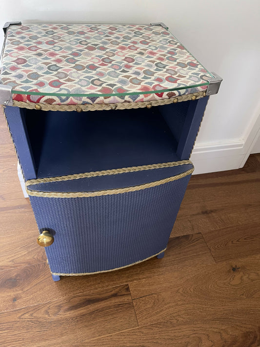 Bedside table glass top, floral print material, gold trim, blueberry paint