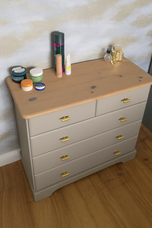 Upcycled Bedroom Set in Fusion ‘Algonquin’ with Light Oak-Stained Tops | Chest of Drawers + Pair of Bedside Tables