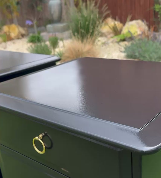 Matching dark green cabinets or large bedside tables with wooden top