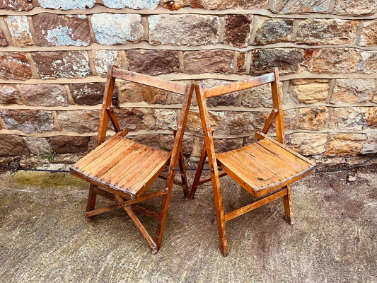 Pair of Vintage Wooden Folding Chairs – Rustic Slatted Seating | Cottage Farmhouse Decor