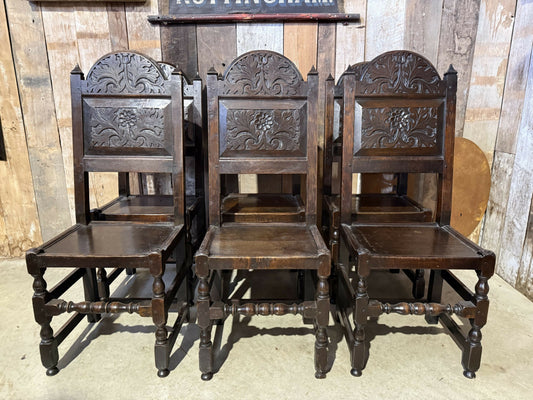Antique Set Six 6 Oak Cromwellian Revival High Back Carved Edwardian Dining Chairs, c1920
