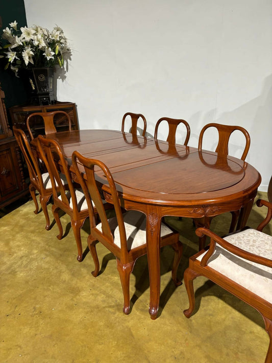 Vintage oriental style Chinese rosewood extending dining room table having two extra leaves and eight dining chairs