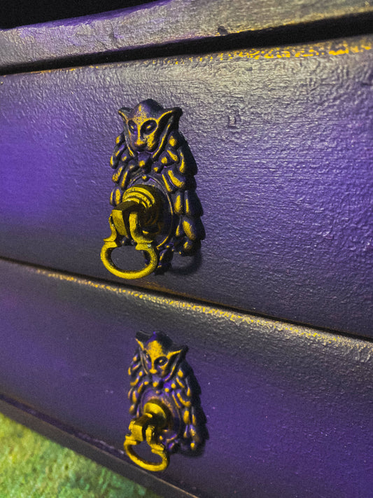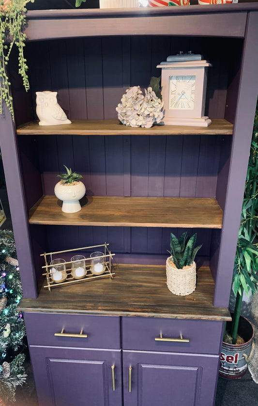 Apothecary cabinet wall mounted display shelf and drawers in purple & pink