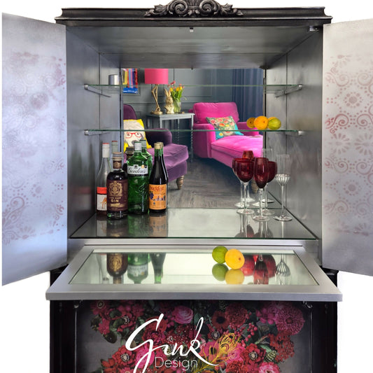 "Regency Cocktail Cabinet – Art Deco Vintage Drinks Bar | Handcrafted Statement Liquor Storage | Gold Leaf & Mirror Display Unit"