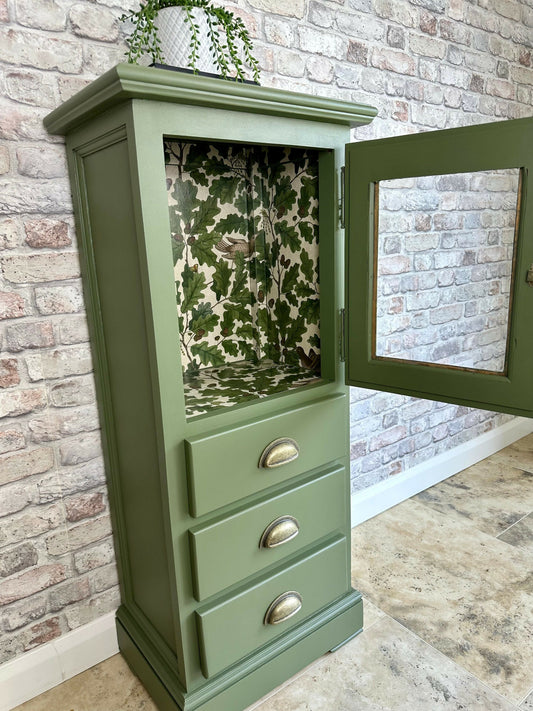 Bayberry Green Display Cabinet – Hand Painted with Oak Leaf Interior Decoupage