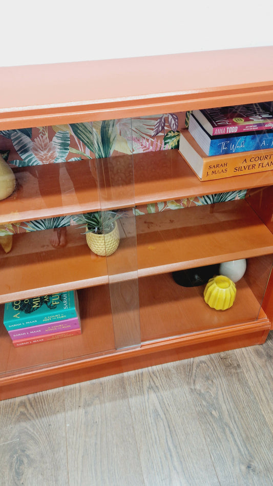 G plan orange vintage book shelf- glass display cabinet