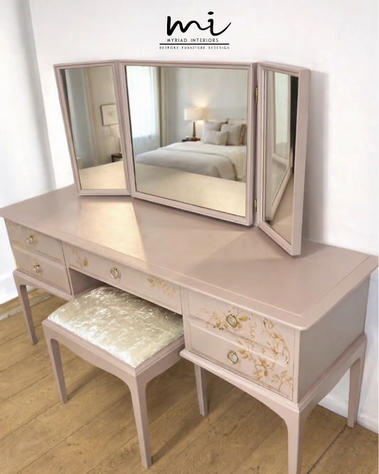 Painted to Order Pretty Dusky pink Stag Minstrel dressing table art with gold birds and flower design. Rose