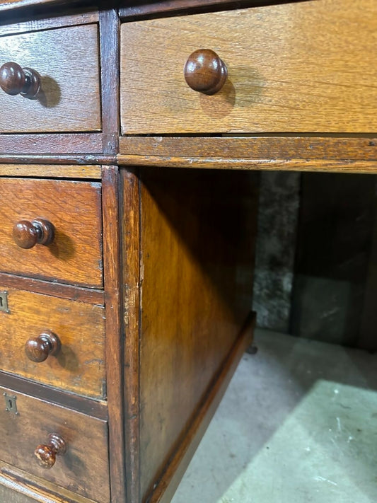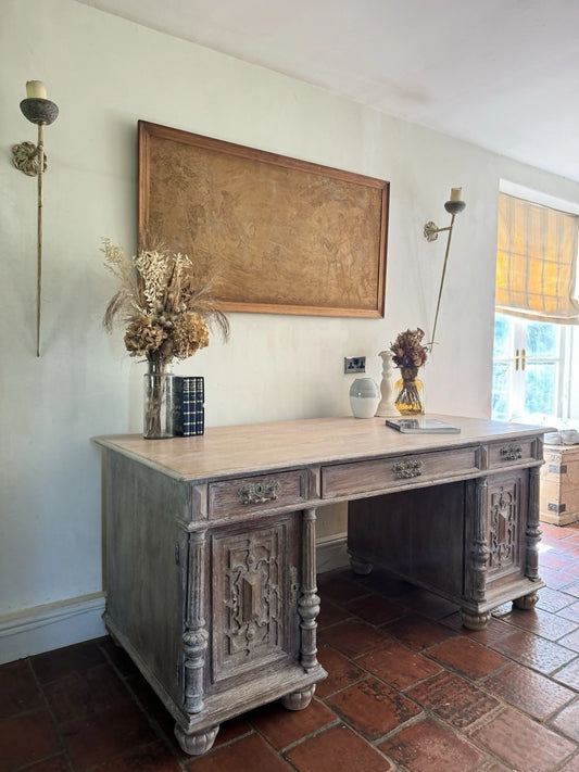 Antique Ornate Dutch Oak Lime Waxed Pedestal Kneehole Desk