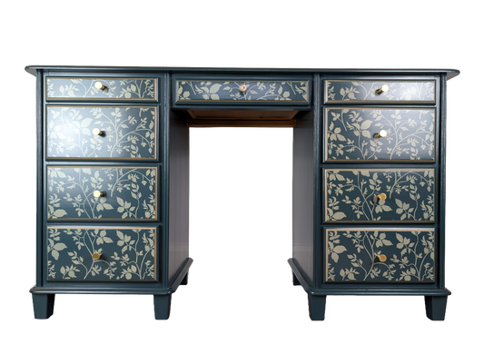 Hand Painted Upcycled Solid Pine Desk – Dark Green Botanical 9 Drawer Desk – Statement Workspace Furniture