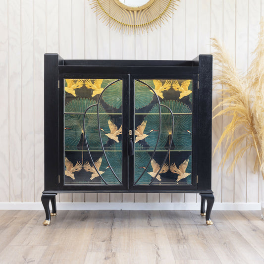 Exquisite Art Deco drinks cabinet decoupaged in a striking blend of emerald, subtle gold and black crane fabric. Sold, commission available.