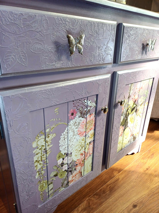 Upcycled Lilac and Silver Floral Cupboard with Two Storage Drawers