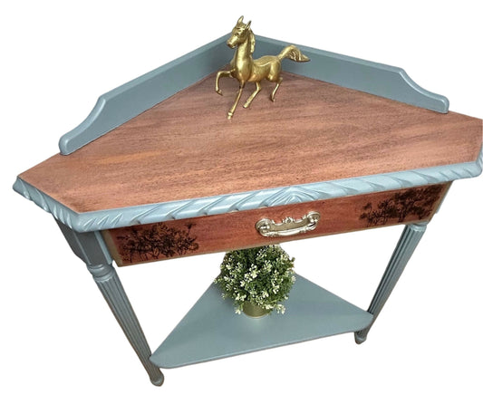 Blue painted corner console / telephone table with shelf and pull out drawer